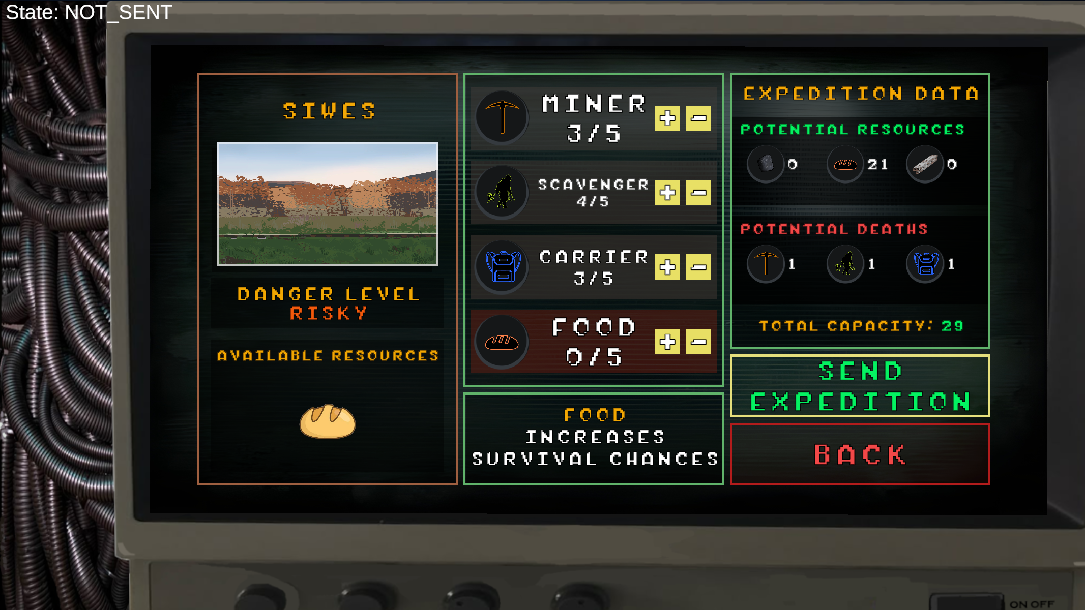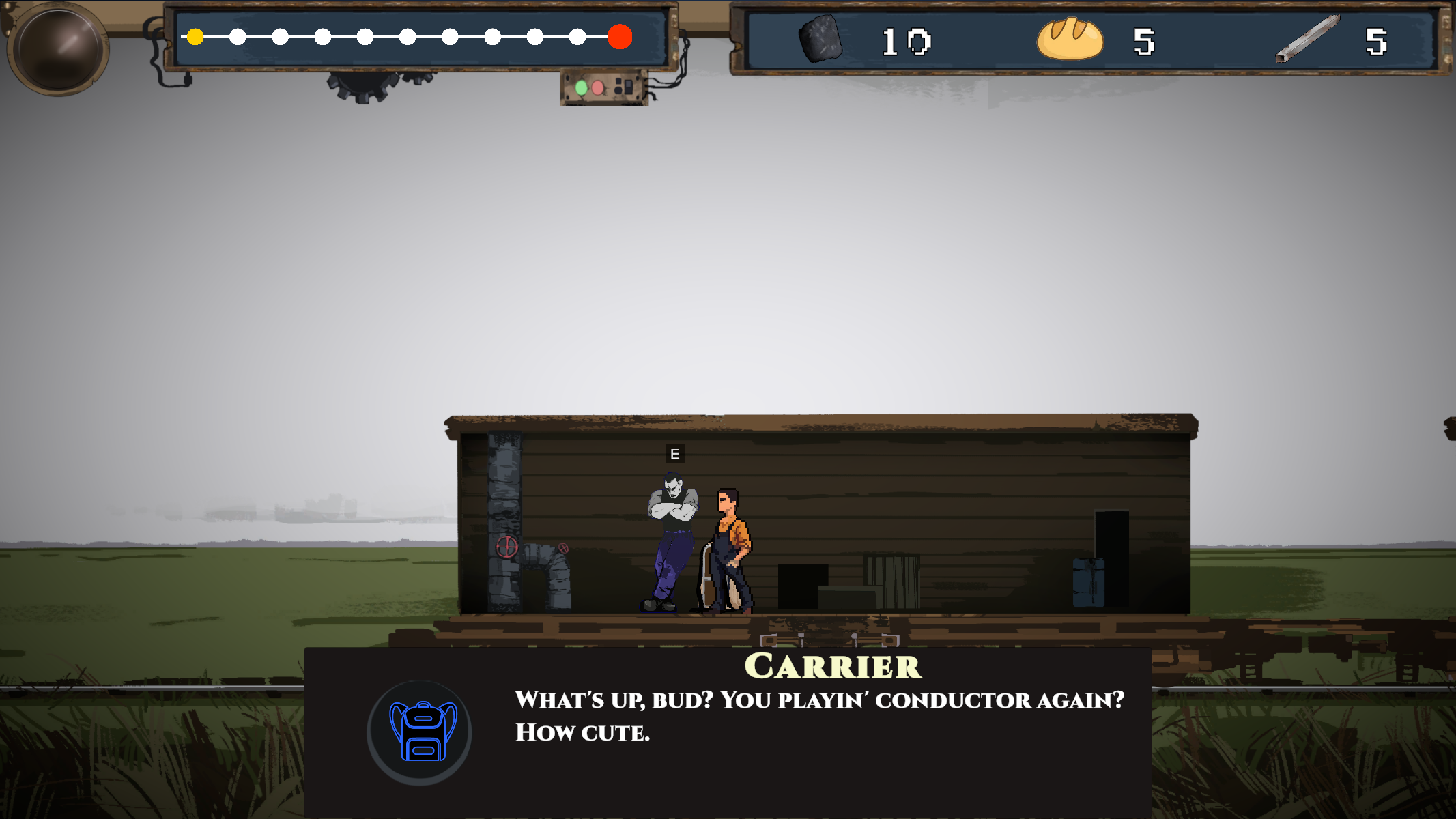 Terminal Express is a management survival game set on a run-down train crossing through a post-apocalyptic world. Carefully manage your diminishing resources to keep the train operational and maintain the morale of the passengers. Travel the different areas of this abandoned world. Decide which passengers to send on deadly expeditions to gather more resources. Make difficult choices to ensure that the train reaches the final station at all costs.